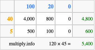 Below is an illustration showing you how to calculate 120 times 45 using the box method, using the instructions above.