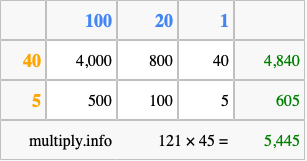 Finally, we add up all the sums we found in step 3 to get our final answer to 121 times 45.