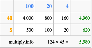 That's all there is to it! As you can see from the box above, the answer to 124 times 45 using the box method is 5,580.