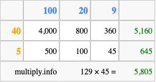 That's all there is to it! As you can see from the box above, the answer to 129 times 45 using the box method is 5,805.