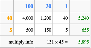 That's all there is to it! As you can see from the box above, the answer to 131 times 45 using the box method is 5,895.