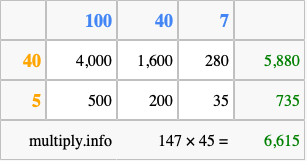 That's all there is to it! As you can see from the box above, the answer to 147 times 45 using the box method is 6,615.