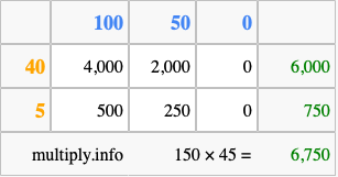 Below is an illustration showing you how to calculate 150 times 45 using the box method, using the instructions above.