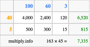 Below is an illustration showing you how to calculate 163 times 45 using the box method, using the instructions above.