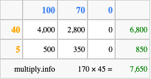 Below is an illustration showing you how to calculate 170 times 45 using the box method, using the instructions above.