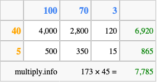 That's all there is to it! As you can see from the box above, the answer to 173 times 45 using the box method is 7,785.