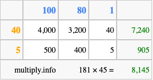 Below is an illustration showing you how to calculate 181 times 45 using the box method, using the instructions above.