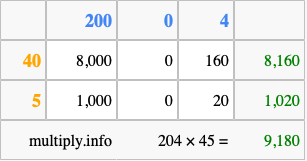 Below is an illustration showing you how to calculate 204 times 45 using the box method, using the instructions above.