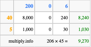 Below is an illustration showing you how to calculate 206 times 45 using the box method, using the instructions above.