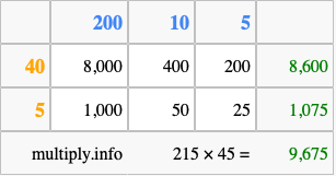 Below is an illustration showing you how to calculate 215 times 45 using the box method, using the instructions above.