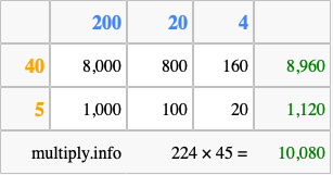 Finally, we add up all the sums we found in step 3 to get our final answer to 224 times 45.
