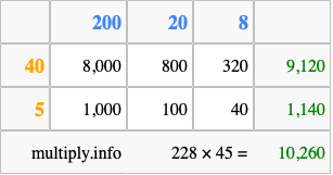 Below is an illustration showing you how to calculate 228 times 45 using the box method, using the instructions above.