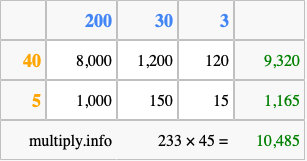 Below is an illustration showing you how to calculate 233 times 45 using the box method, using the instructions above.