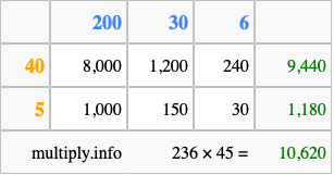 Finally, we add up all the sums we found in step 3 to get our final answer to 236 times 45.
