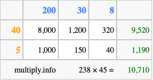 Finally, we add up all the sums we found in step 3 to get our final answer to 238 times 45.