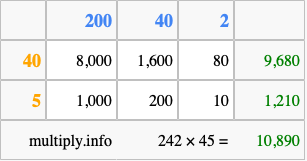 Below is an illustration showing you how to calculate 242 times 45 using the box method, using the instructions above.