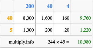 Below is an illustration showing you how to calculate 244 times 45 using the box method, using the instructions above.