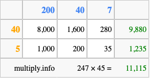 Below is an illustration showing you how to calculate 247 times 45 using the box method, using the instructions above.