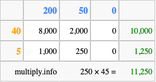 Below is an illustration showing you how to calculate 250 times 45 using the box method, using the instructions above.