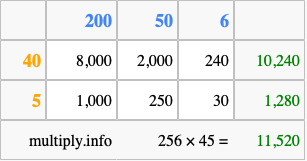 That's all there is to it! As you can see from the box above, the answer to 256 times 45 using the box method is 11,520.