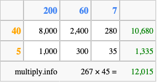 Below is an illustration showing you how to calculate 267 times 45 using the box method, using the instructions above.