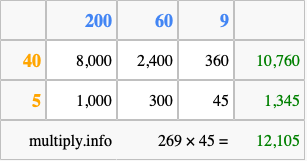 Finally, we add up all the sums we found in step 3 to get our final answer to 269 times 45.