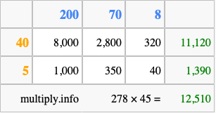 That's all there is to it! As you can see from the box above, the answer to 278 times 45 using the box method is 12,510.