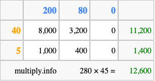 Finally, we add up all the sums we found in step 3 to get our final answer to 280 times 45.