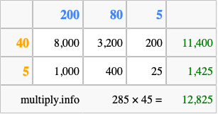 Below is an illustration showing you how to calculate 285 times 45 using the box method, using the instructions above.