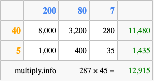 Below is an illustration showing you how to calculate 287 times 45 using the box method, using the instructions above.