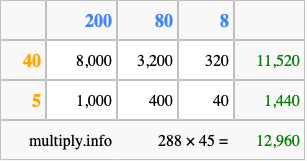 That's all there is to it! As you can see from the box above, the answer to 288 times 45 using the box method is 12,960.