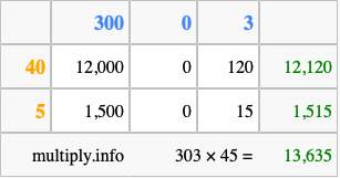 That's all there is to it! As you can see from the box above, the answer to 303 times 45 using the box method is 13,635.