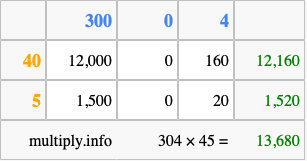 Below is an illustration showing you how to calculate 304 times 45 using the box method, using the instructions above.