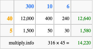 Below is an illustration showing you how to calculate 316 times 45 using the box method, using the instructions above.