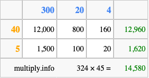 That's all there is to it! As you can see from the box above, the answer to 324 times 45 using the box method is 14,580.