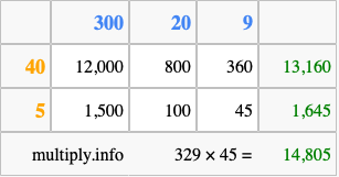 That's all there is to it! As you can see from the box above, the answer to 329 times 45 using the box method is 14,805.