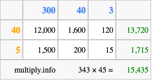 Finally, we add up all the sums we found in step 3 to get our final answer to 343 times 45.