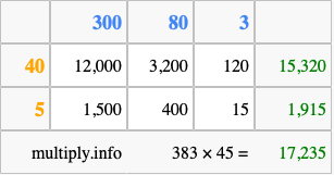 That's all there is to it! As you can see from the box above, the answer to 383 times 45 using the box method is 17,235.