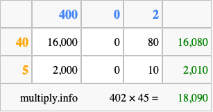 That's all there is to it! As you can see from the box above, the answer to 402 times 45 using the box method is 18,090.