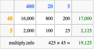 Below is an illustration showing you how to calculate 425 times 45 using the box method, using the instructions above.