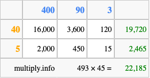 Finally, we add up all the sums we found in step 3 to get our final answer to 493 times 45.