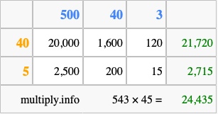 Finally, we add up all the sums we found in step 3 to get our final answer to 543 times 45.