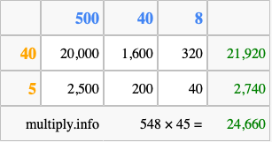 Below is an illustration showing you how to calculate 548 times 45 using the box method, using the instructions above.