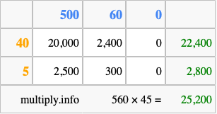 Below is an illustration showing you how to calculate 560 times 45 using the box method, using the instructions above.