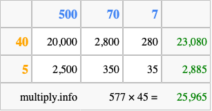 That's all there is to it! As you can see from the box above, the answer to 577 times 45 using the box method is 25,965.