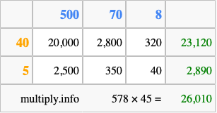 Below is an illustration showing you how to calculate 578 times 45 using the box method, using the instructions above.