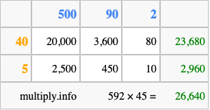 Finally, we add up all the sums we found in step 3 to get our final answer to 592 times 45.