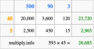That's all there is to it! As you can see from the box above, the answer to 593 times 45 using the box method is 26,685.
