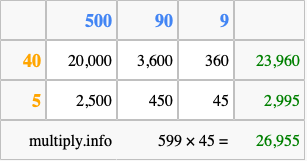 That's all there is to it! As you can see from the box above, the answer to 599 times 45 using the box method is 26,955.