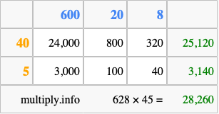 Below is an illustration showing you how to calculate 628 times 45 using the box method, using the instructions above.